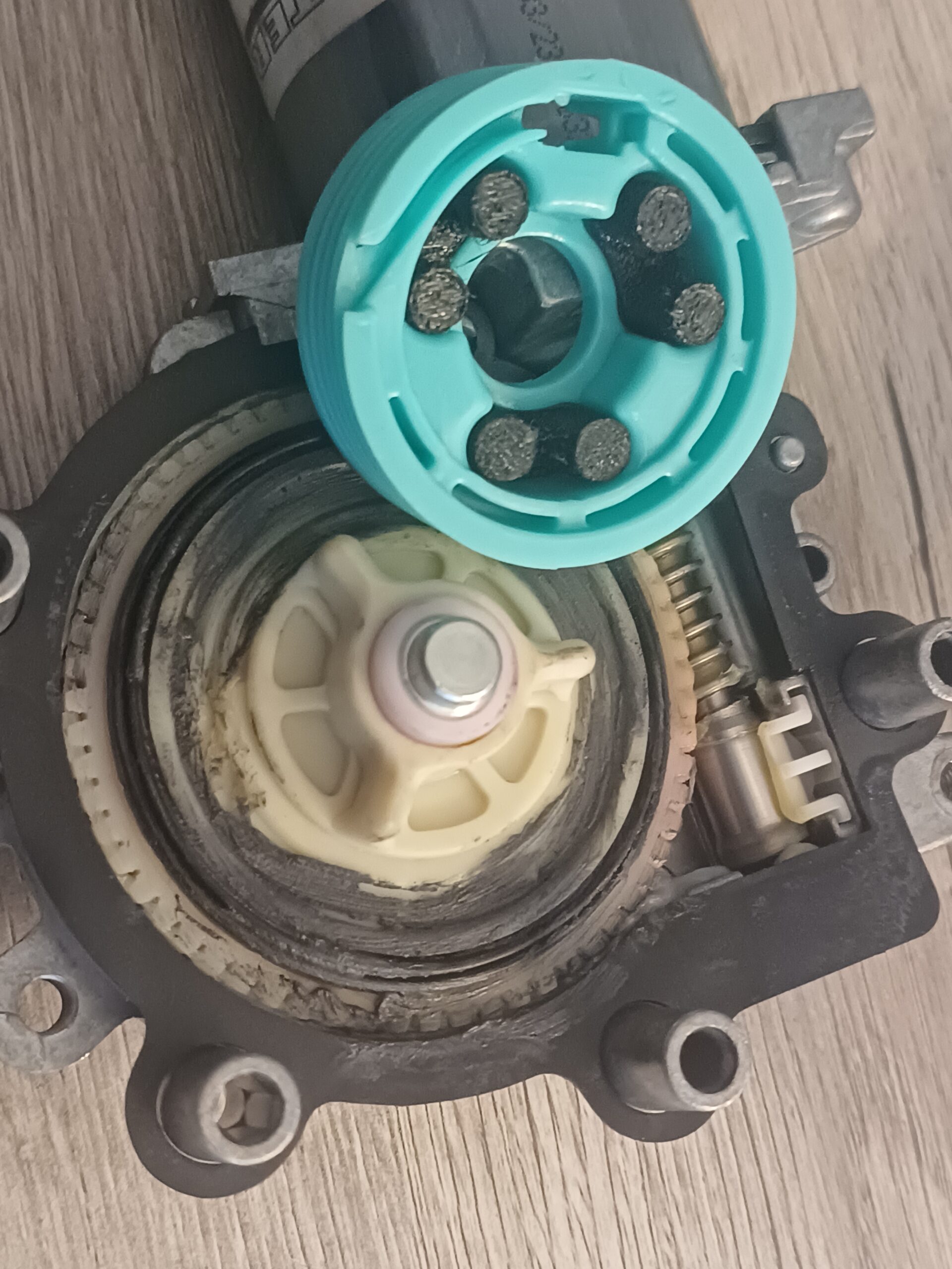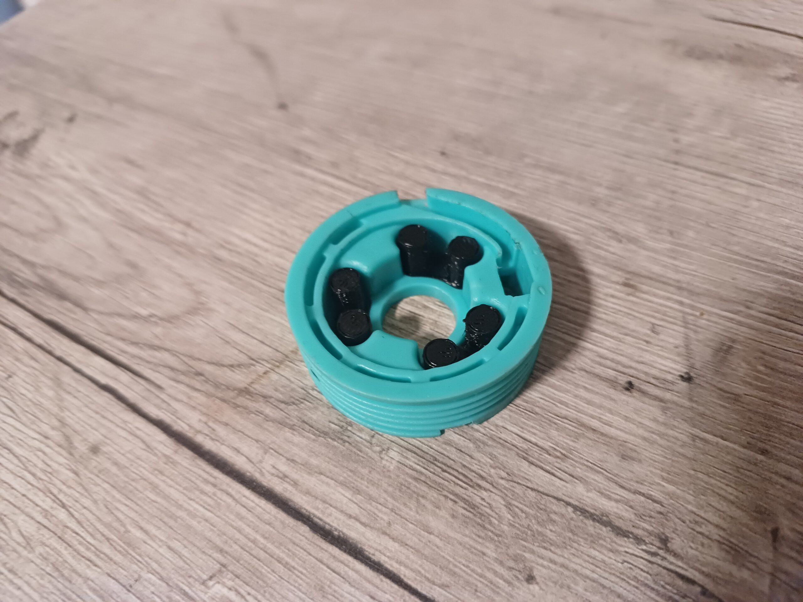 - Die Gummi-Elemente, die in der Kunststoff-Spule sitzen. Diese sind nach 30 Jahren meist total zerbröselt. Die sind aber wichtig damit der Motor sanft und ohne Spiel anfahren kann, ansonsten ist der nächste Defekt vorprogrammiert. Sie sind aus TPU gefertigt, das eine ähnliche Steifigkeit aufweist wie das Original, jedoch deutlich abriebfester ist und somit nicht mehr verschleißt.