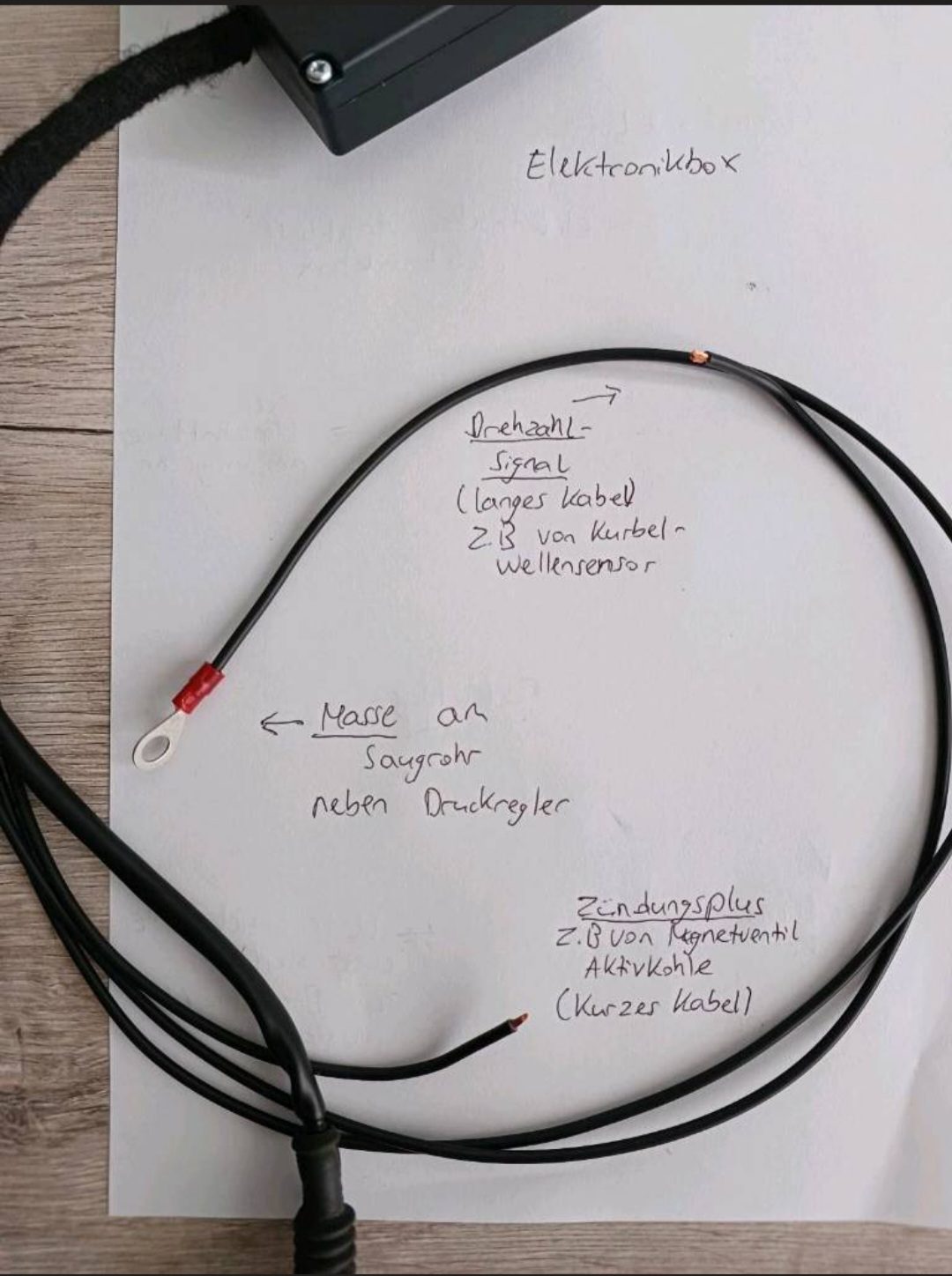 Fertig verdrahtet mit originalem Stecker für das Magnetventil, Ring-Kabelschuh für die Masseverbindung, sowie jeweils ein Kabel für das Drehzahlsignal und für Zündungsplus.